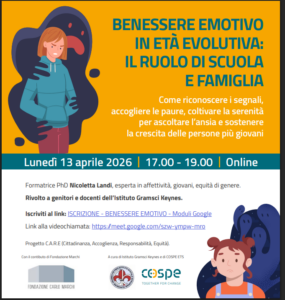 Il Gramsci Keynes, propone, grazie al progetto C.A.R.E., un significativo incontro su uno dei temi oggi più attuali: il benessere emotivo dei nostri giovani. Insieme alla dott.ssa *Nicoletta Landi* capiremo le possibili origini dell’ansia e cosa possono fare famiglia e scuola per fronteggiare questa delicata realtà. Per iscriversi all’incontro on line è sufficiente cliccare il link al modulo presente nel volantino, o contattare la referente prof.ssa Clementina Savino